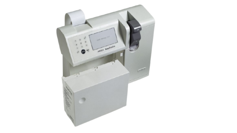 O EasyBloodgas é um analisador de gasometria desenvolvido para medir pO₂, pCO₂ e pH em sangue total, utilizando volumes reduzidos (100 µL em seringa e 75 µL em capilar). Ele mantém a amostra a 37 °C ± 0,2 °C e entrega resultados rápidos em cerca de 125 segundos.